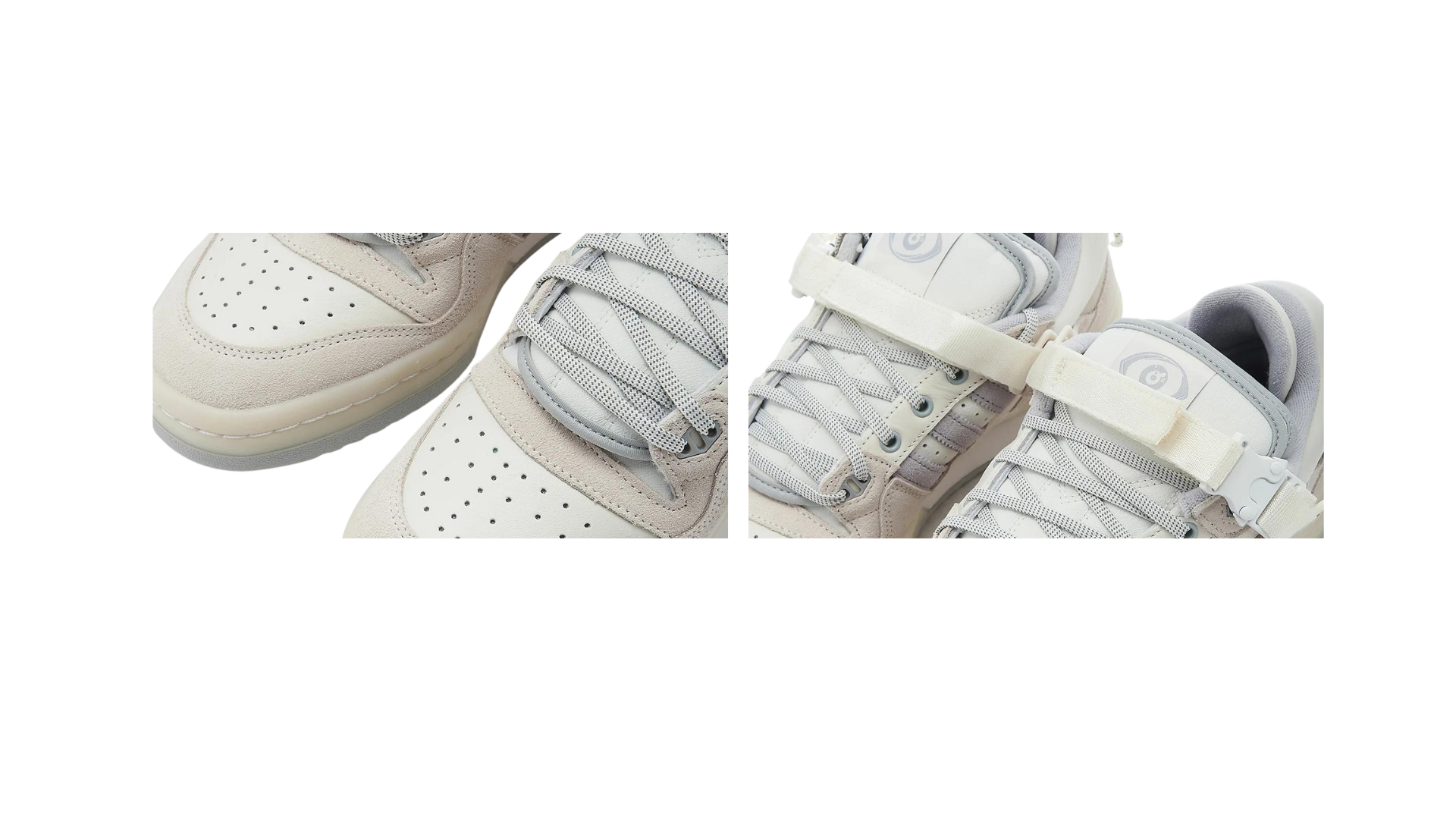 La quinta y última combinación de colores en el catálogo del modelo, la hebilla baja Bad Bunny x adidas Forum "The Last" yuxtapone el verano y el invierno, brindando un "estado de ánimo constante de calidez y alegría" durante la época más fría del año. Tomando prestadas señales de diseño de la temporada más gélida, el zapato está revestido en tonos de blanco y crema, que se alternan en los accesorios de gamuza y cuero, así como en los herrajes adyacentes.