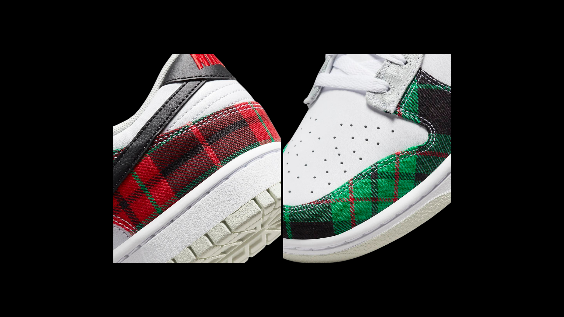 Ubicado sobre una parte superior de cuero blanco simple, las lengüetas y entresuelas de nailon blanco a juego del par se encuentran con forros y suelas de color gris claro que brindan un punto de anclaje bastante tenue para el par. Las cosas se animan a partir de ahí, y un trío de telas escocesas viste las capas superpuestas, incluidos tejidos de base verde en la puntera y el cuello, escala de grises en los ojales y el clásico tartán rojo en la parte trasera. Las superposiciones de cuero negro se presentan luego en el Swoosh y las superposiciones del talón, con etiquetas de lengüeta negras y rojas descansando en la parte superior para completar el diseño.