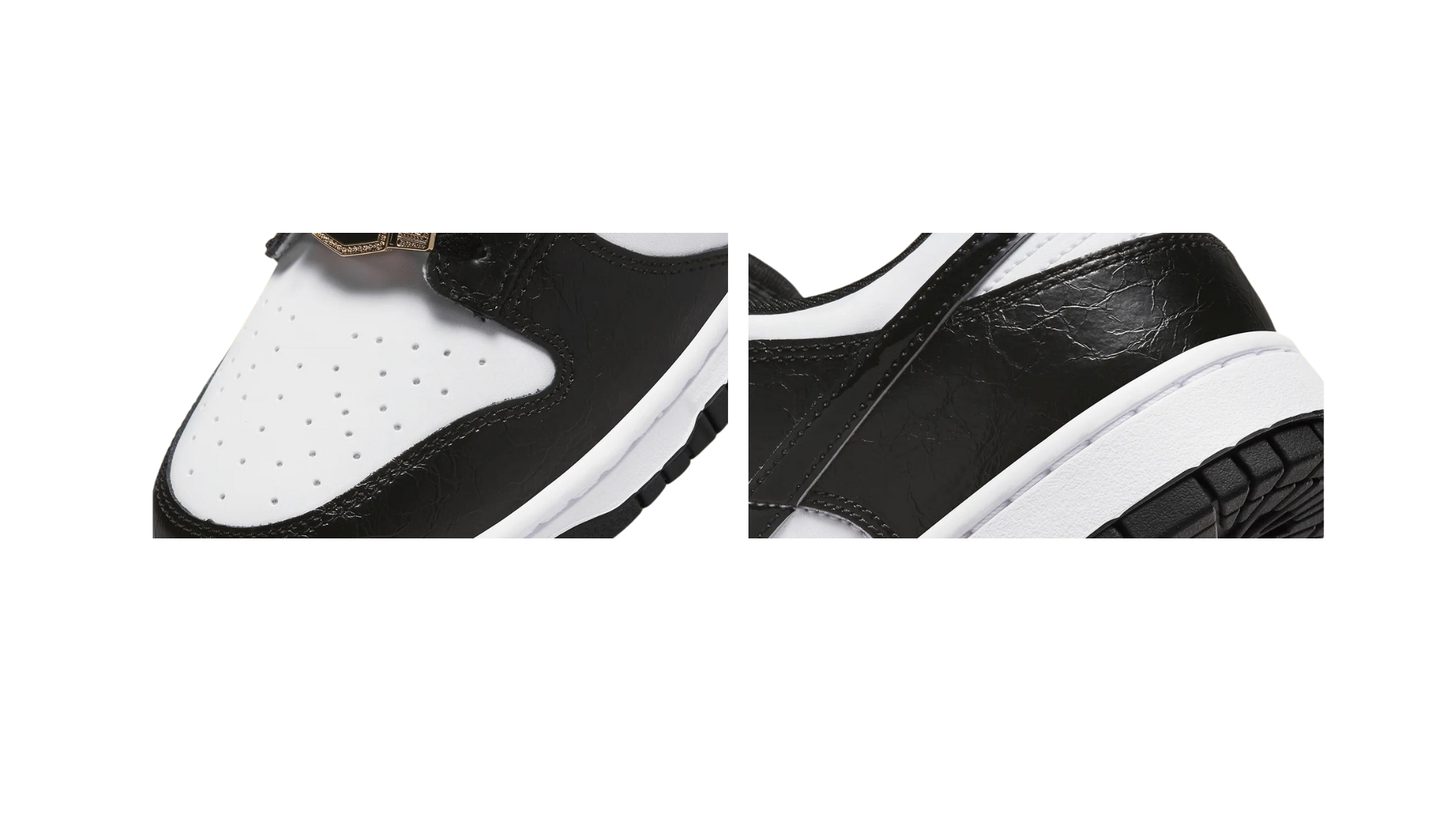 Si bien el bloque de color blanco/negro es una copia clara de la reciente moda de "Panda", el cuero texturizado parece aferrarse a un toque de cuero de lujo. La marca dorada de NIKE en las etiquetas de la lengüeta y el talón nos recuerda a los acentos dorados de la colaboración Nike SB Dunk High de Supreme de 2003, mientras que el preciado cinturón en las dubrae de encaje podría ser un guiño al mantra "Campeones del Mundo" de la marca de skate/street. La plantilla, sin embargo, es de color morado, con la marca que ofrece un patrón similar al de un camuflaje de tigre.