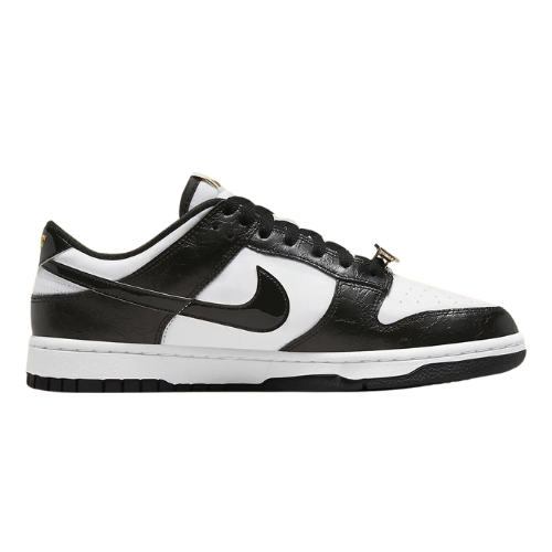 Las Nike Dunk Low SE 'World Champ' embellecen la clásica silueta bicolor con decoraciones influenciadas por el mundo de la lucha libre profesional. La zapatilla de caña baja presenta una base de cuero blanco con superposiciones de cuero agrietado negro. La parte superior está acentuada por un Nike Swoosh de charol negro y la marca Nike bordada en oro metálico. Un guiño a un cinturón de campeonato de lucha libre se encuentra en forma de joyas de encaje chapadas en oro, mientras que una suela de goma negra completa el look.