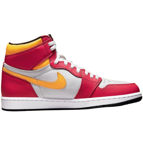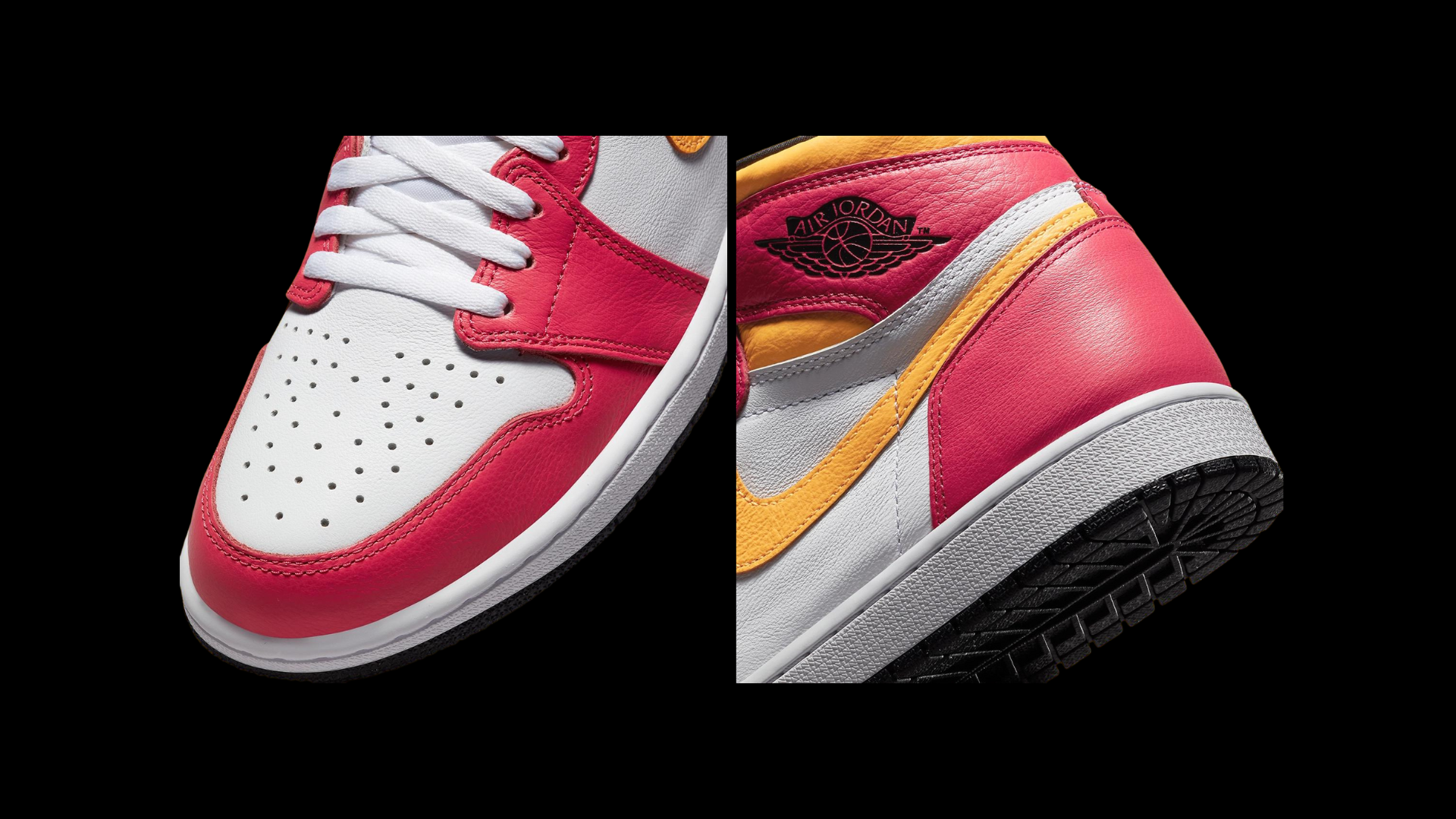 Air Jordan 1 Retro High OG 'Light Fusion Red' trata la silueta icónica con un cambio de imagen enérgico, resaltado por una parte superior de cuero blanco con superposiciones de color rosa oscuro en contraste. Los detalles en naranja láser aterrizan en el cuello y el Swoosh característico. Ambos colores se muestran en degradado en el logotipo de Nike Air que adorna la etiqueta de la lengüeta. La parte superior alta se monta en una suela de goma estándar, que alberga una cuña de espuma resistente mejorada con amortiguación Nike Air.