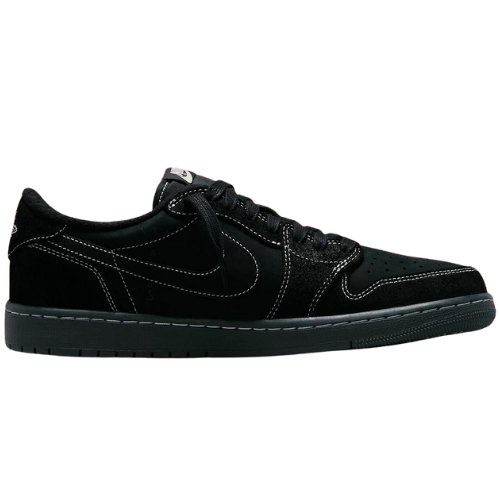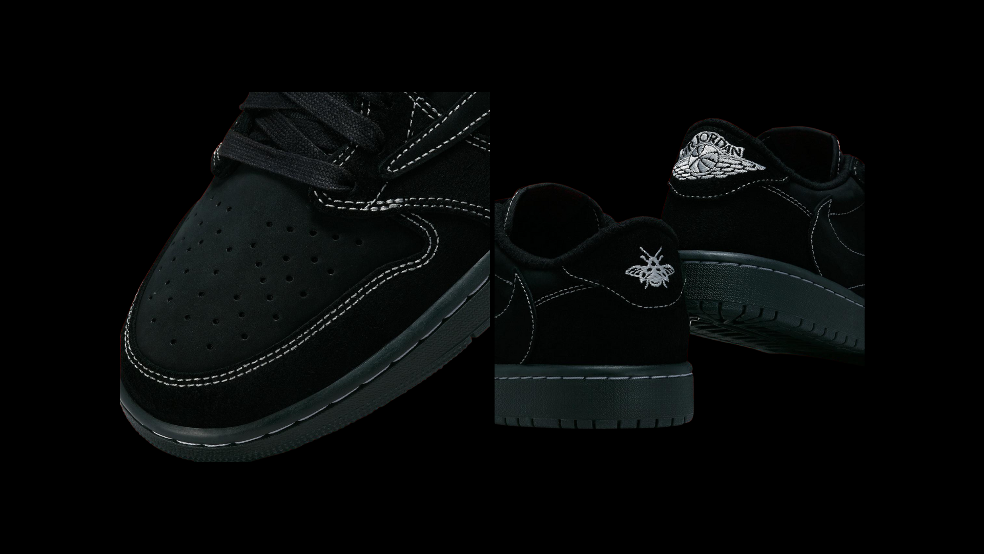 Travis Scott x Air Jordan 1 Low OG SP 'Black Phantom' ve al rapero con sede en Houston coloreando otro AJ1 Low. Esta iteración presenta un aspecto oscurecido, con nubuck y gamuza en la parte superior subrayada por costuras blancas en contraste en todas partes. Se mantiene el Swoosh inverso característico de Scott, junto con un Swoosh regular en el lado medio con la marca Cactus Jack. El talón trasero presenta una marca que no coincide, con un logotipo de Wings en el zapato derecho y un gráfico de abeja en el izquierdo.