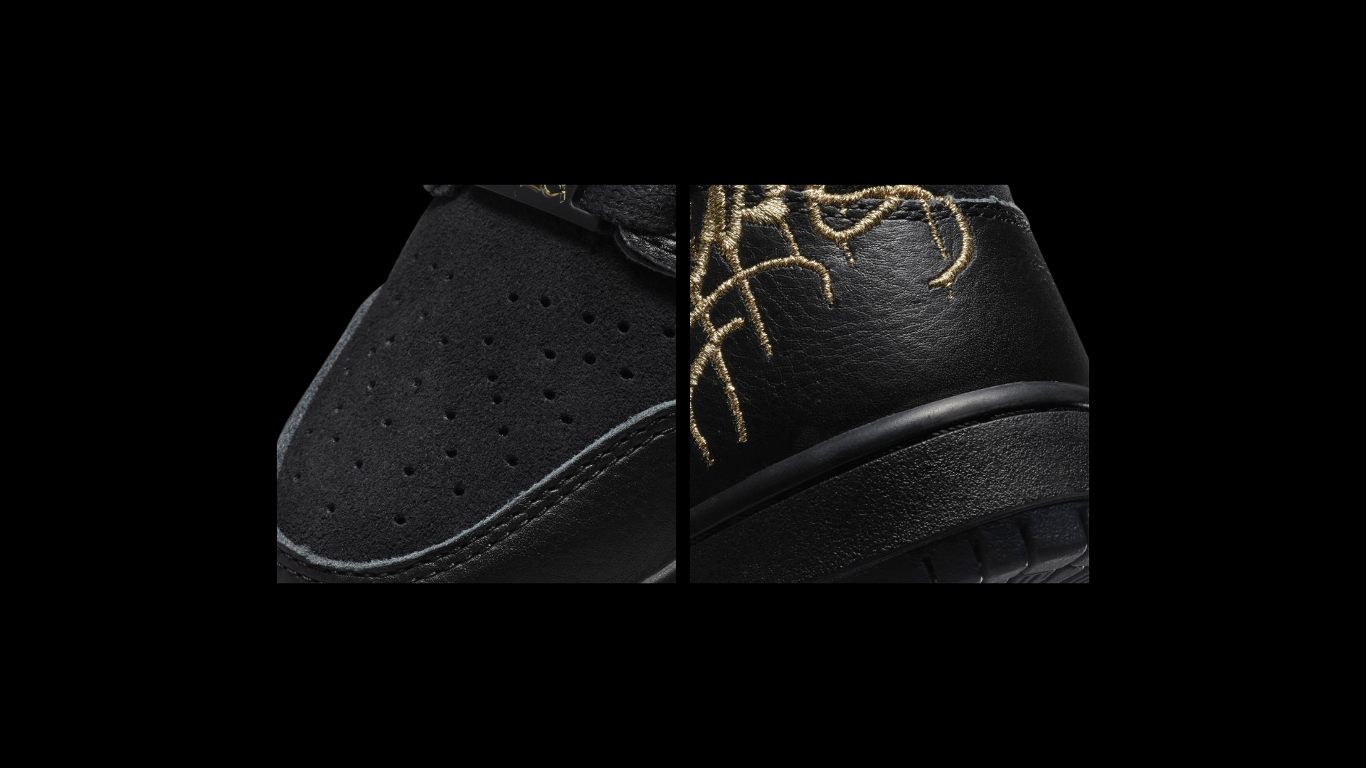 Para celebrar el vigésimo aniversario de Nike SB, las FAUST x Nike Dunk High SB 'The Devil is in the Details' incorporan la experiencia en diseño del artista de graffiti FAUST con sede en Nueva York. La parte superior aparece en una base de gamuza negra combinada con refuerzos en el antepié y el talón en cuero abatanado del mismo tono. El zapato izquierdo presenta "Sure Faust" inscrito en letras cosidas en oro, en homenaje a Shure, el difunto socio y amigo de Faust. En el zapato derecho, las letras de gran tamaño deletrean "All That Matters". El lado interior de cada solapa del cuello presenta la frase repetida 'Sure Faust', mientras que las plantillas se alternan con las frases 'Sell Your Soul' y 'Sell Your Sole'. La zapatilla alta está terminada con una suela de goma negra sólida.