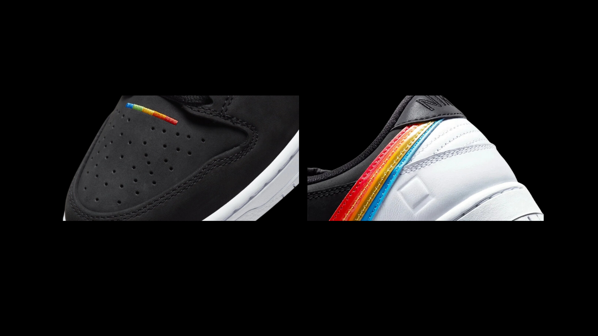 la parte superior baja hace alarde de una parte superior de cuero negro/nubuck con el punto culminante dirigido a los Rainbow Swooshes como tributo al logotipo de Polaroid. Los toques finales consisten en blanco que aparece en las lengüetas, los talones y la suela de goma de la marca, seguido de puntas de cordones de marca compartida y plantillas multicolores para completar el maquillaje.