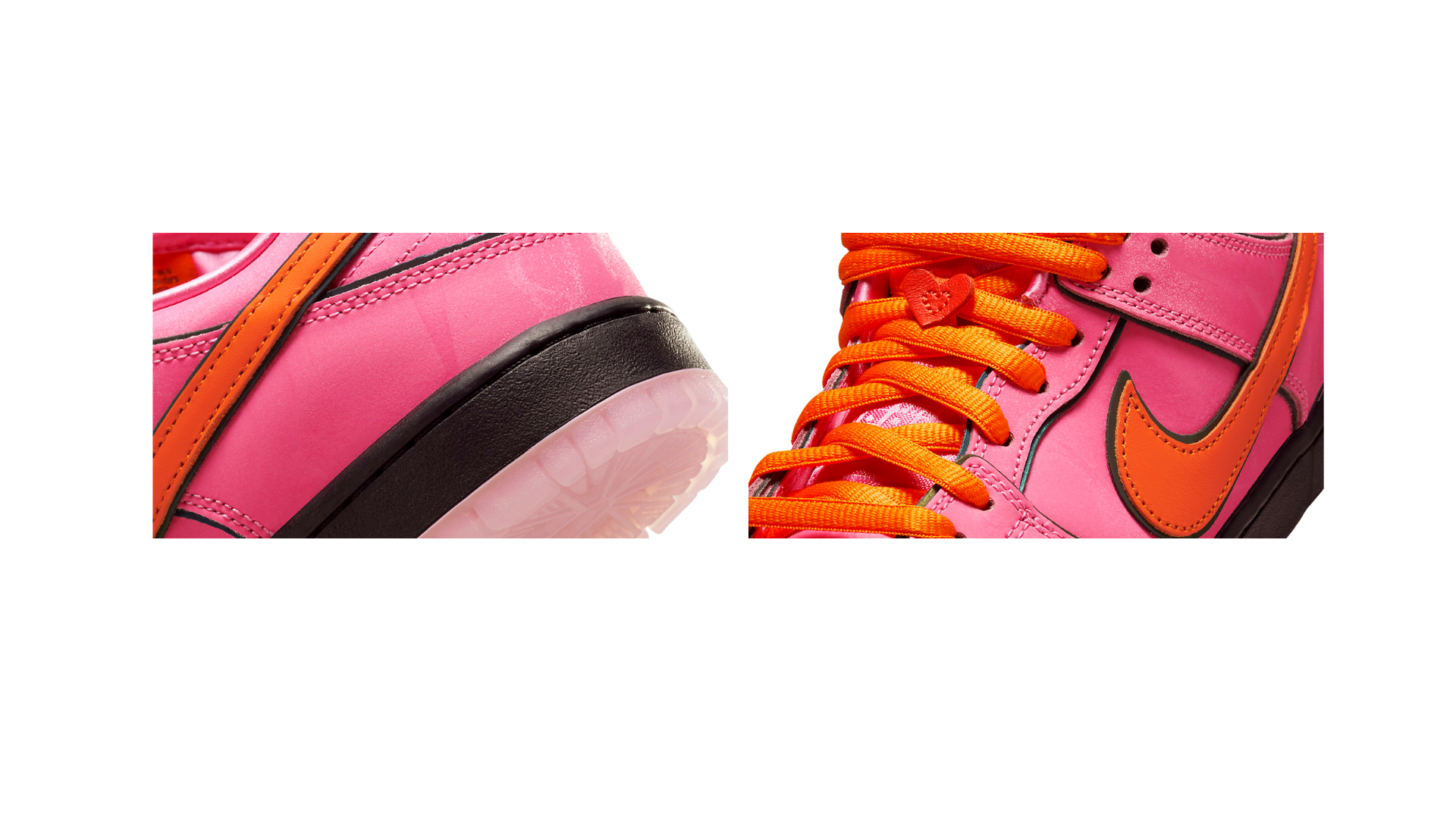 Las Powerpuff Girls x Nike SB Dunk Low "Blossom" reflejan fielmente la paleta de colores de la autoproclamada líder del equipo. La parte superior rosa y la entresuela oscurecida están directamente inspiradas en su elección de atuendo, mientras que el Swoosh naranja brillante y los cordones a juego hacen referencia al cabello del personaje. Además, los tacones cuentan con los ojos grandes característicos de los niños de jardín de infantes con superpoderes; los embellecedores están revestidos con un acabado reflectante; La lengüeta está superpuesta con muchas instancias del logotipo del programa; Y las plantillas están cubiertas de punta a punta con innumerables globos de diálogo de colores brillantes, al estilo de los cómics.