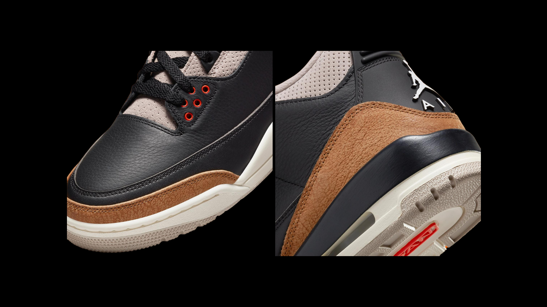 El Air Jordan 3 Retro 'Desert Elephant' presenta materiales y bloques de color que se mantienen fieles al lanzamiento original de la silueta icónica de 1988. La parte superior está confeccionada con cuero curtido negro con revestimientos exclusivos con estampado de elefante en un acabado de color canela claro. El tono neutro se repite en el cuello, los ojales y la lengüeta, este último acentuado con un logotipo carmesí de Jumpman. Apoyando la parte superior media hay una entresuela de poliuretano blanco con una unidad Air-sole visible ubicada debajo del talón.